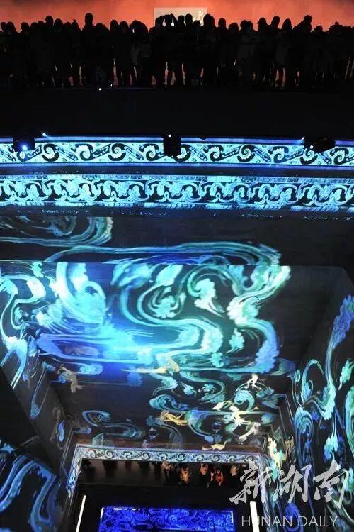 特别的是,我们运用高科技手段,将老娭毑“新家”——17米深的“墓坑”变成成电子屏幕,交替呈现巨龙腾翔、神兽飞跃、仙人游乐等连环画似的景象,再现了2200年前汉人的升天梦想和永生渴望。