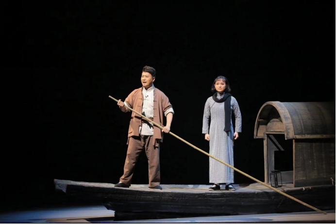 当然,戏剧舞台上小人物小角色的叙写也很重要,将其写好可丰满大人物的形象塑造,也能促进剧情的互动发展。第六场,“示警拖敌”是全剧的情感高潮戏,洪大娘由省艺术研究院的徐欣扮演,她曾在获得国家艺术基金资助项目歌剧《爱莲说》中饰演女二号。在此剧中她饰演老旦,一个满脸皱纹、头发斑白的六十多岁老妪,革命的老太太,当叛徒带着矿警埋伏在她家外面,为了告诉即将前来开会的洪雁、宋乔生们,万般无奈,她毅然点燃了自家的茅草屋,更为了拖住敌人,她用自己的身体葡伏在地,死死抱住对方的腿,壮烈牺牲。这一场戏份相对比较饱满,宋乔生、洪雁的深情缅怀,使该剧的情感戏部分达到高潮。