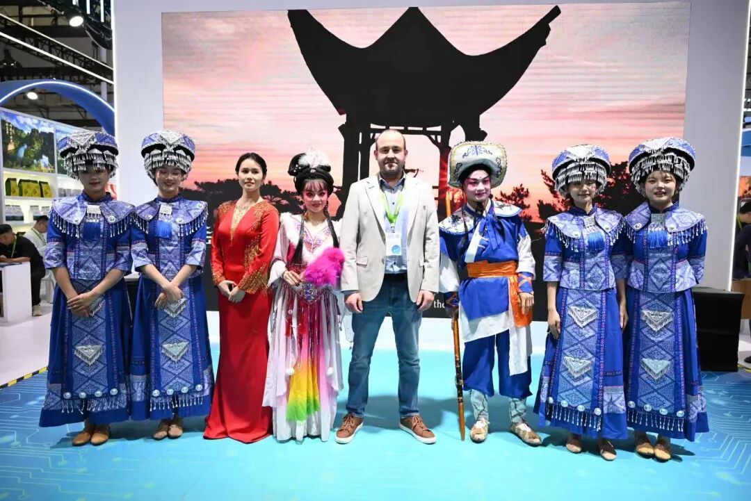 湖南展区位于4号馆核心位置,以“三湘四水 相约湖南”为主题,巧妙融合湖湘山水神韵与现代设计美学,成为全场亮点。展区不仅以高清影像等形式呈现张家界、凤凰古城等绝美风光,更通过动态文化展演传递鲜活湖湘魅力。旅游产品推介与经典花鼓戏《刘海砍樵》、悠扬湖南民歌等非遗表演轮番登场,吸引了众多国际旅行商驻足沉浸、拍照互动,于视听盛宴中开启一场探索湖南的“双向奔赴”。