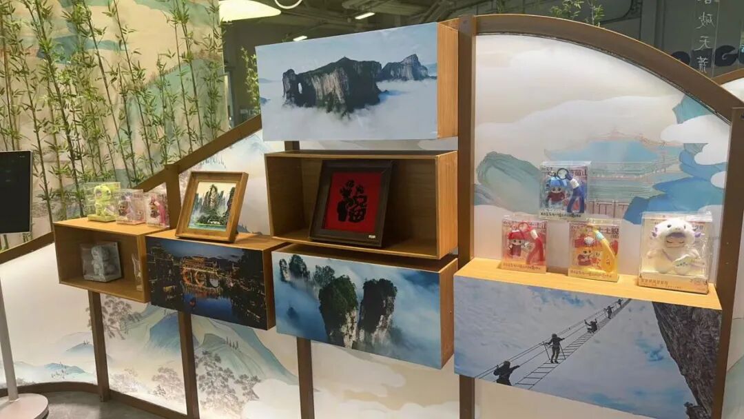 现场重点展示了大张家界国际旅游区特色文创产品,品类丰富且特色鲜明,既有土家族、苗族非遗手工产品,尽显民族文化底蕴,也有融合张家界地貌特色与人文理念、兼具艺术价值与市场认可度的砂石画艺术品;还有以大鲵为原型打造的“山鲵界品”系列手办,萌趣新颖又具地域标识。此外,还向到访嘉宾发放湖南文旅宣传折页、旅游地图等资料,以及大张家界国际旅游区文旅宣传手册,全方位传递湖南文旅资讯。
