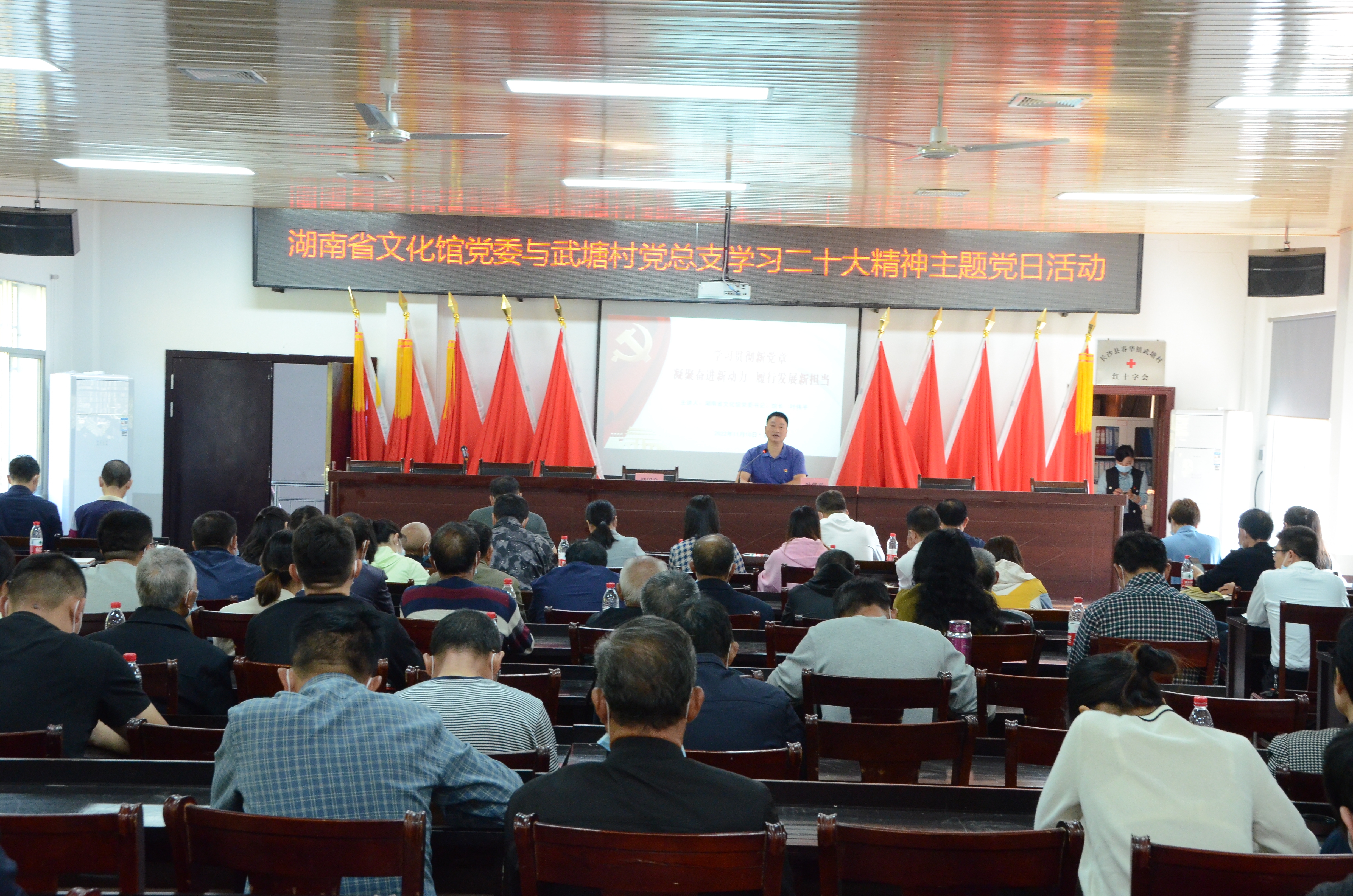 在长沙县春华镇武塘村村委二楼大会议室,省文化馆党委书记、馆长叶伟平以《学习贯彻新党章,凝聚奋进新动力,履行发展新担当》为题开展党的二十大宣讲,他主要从树牢信仰,以党章为“灯塔”,坚定政治方向;夯实根基,以党章为“镜子”,提高政治站位;知行合一,以党章为“标杆”,强化政治素养三个方面进行阐述。武塘村党总支书记褚国良以《深入学习宣传贯彻党的二十大精神,扎实开展“三建三新”活动》为题,从三个方面作介绍,一是建好干群大讲台,讲好新思想;二是建好共建大舞台,展现新形象;三是建好发展大擂台,拼出新业绩。