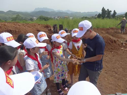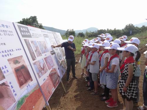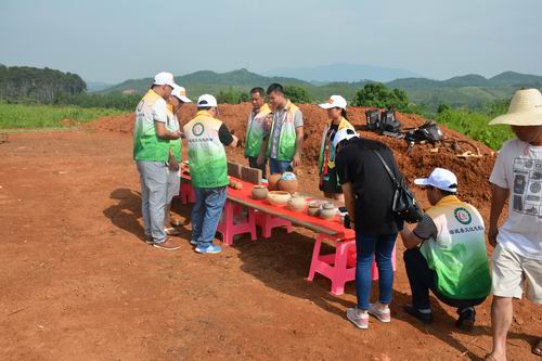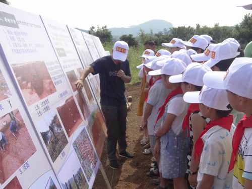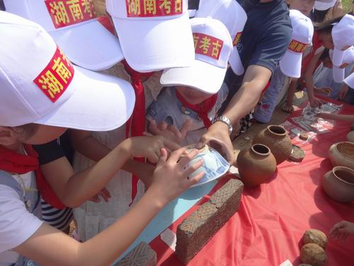 在活动现场,渡头考古队领队陈斌为受邀而来的二十四名小学生以及自愿前来参加活动的文化志愿者,详细讲解了“什么是考古”、“怎么进行考古”以及考古发掘的意义。同时结合渡头古城遗址、墓葬出土的遗物,给同学们生动介绍了遗物的种类、用途,极大的引起了同学们的兴趣,纷纷询问遗物的有关知识。