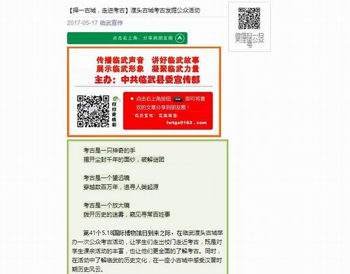 活动前一天,临武县县委宣传部、湖南省文物考古研究所均在官方微信公众号中对活动进行了宣传,临武县文物管理所也将宣传海报打印出来,在文化馆现场宣传栏上进行了宣传。