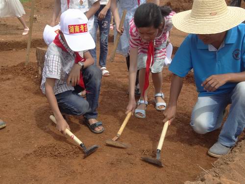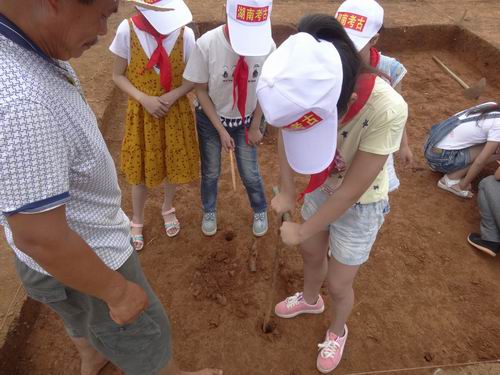 讲解结束后,同学们迫不及待的分组进入探方,开始体验考古发掘。同学们在工作人员的指引下,动手刮面、体验如何使用探铲、发掘灰坑找文物,忙的不亦乐乎,体验了一次考古发掘的乐趣。活动期间,临武县电视台记者进行了现场的采访和报道。