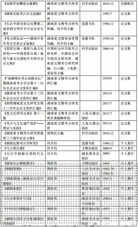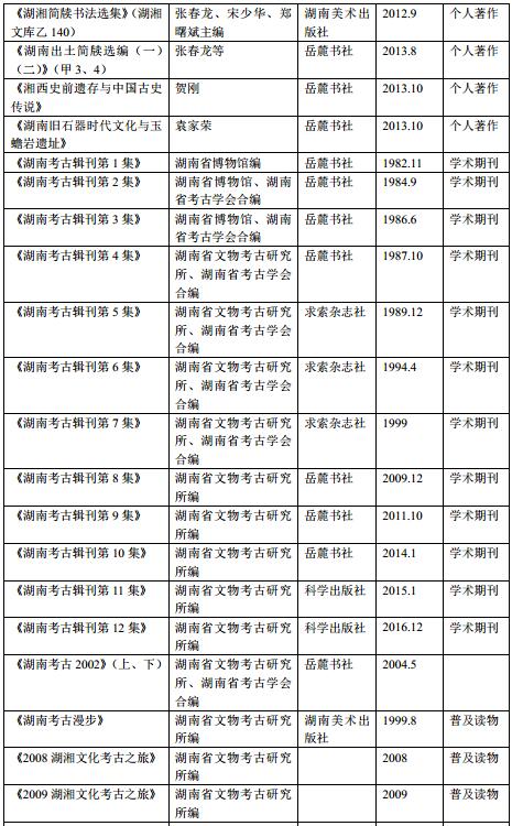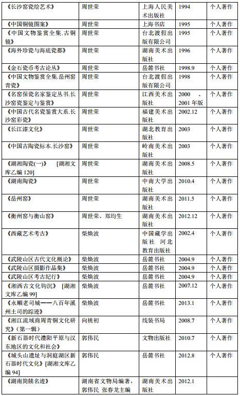 三十年来,我所业务人员辛勤耕耘,取得了大量学术成果。从我所编辑出版的书籍来看,其中既不乏集中体现整个湖南考古界或我所整体研究成果的论文集,如《考古耕耘录——湖南中青年考古学者论文选集》和《湖南省文物考古研究所建所三十周年纪念文集》,也有体现个人研究成果的学术专著,如何介钧的《长江中游新石器时代文化》、《湖南先秦考古学研究》、《马王堆汉墓》;周世荣的《湖南陶瓷》、《湖湘陶瓷(一)》、《岳州窑》、《衡州窑与衡山窑》、《金石瓷币论丛》、《铜镜图案——湖南出土历代铜镜》、《马王堆养生气功》等;袁家荣的《湖南旧石器时代文化与玉蟾岩遗址》;郭伟民的《新石器时代澧阳平原与汉东地区的文化和社会》、《城头山遗址与洞庭湖区新石器时代文化》;贺刚的《湘西史前遗存与中国古史传说》;柴焕波的《湘西古文化钩沉》、《永顺老司城——八百年溪州土司的踪迹》、《湘西画卷(三本)》、《西藏艺术考古》等;张春龙等编的《湖南简牍名迹》、《湖南出土简牍选编(一)(二)》、《湖湘简牍书法选集》等。此外向桃初的《湘江流域商周青铜文化研究》虽然是在他调离我所以后出版的,但书却是他在所工作期间写成的,因此也可视作我所人员的研究成果。从这些书籍中可以看出我所研究体系的特点,即史前考古占有重要地位,且成果最显著;陶瓷、简牍资源丰富,但研究有待加强;商周考古体系初步建立,但尚有不少缺环;秦汉、六朝、隋唐、宋元考古研究尚有许多空白有待填补。从作者年龄来看,既有老一辈的何介钧、周世荣、袁家荣等,也有年富力强的郭伟民、贺刚、柴焕波、张春龙等,反映出我所事业后继有人的可喜势头。