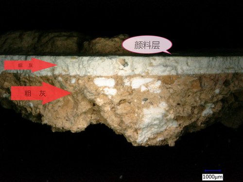这次调查的家庙壁画均是先以掺杂沙子、植物茎秆的灰浆抹平墙面,再涂刷一层细灰,在细灰上作画,制作工艺相对比较简单。(图三、图四)