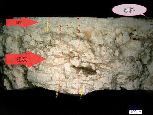 通过调查发现,壁画画面大致用棕、红、黄、绿、蓝等数种颜料绘制而成,我们现场用便携X荧光光谱仪对壁画表面的颜料分别做了现场成分分析,发现棕色颜料为铅丹氧化形成,而红色多为朱砂或朱砂与铅丹的混合颜料;黄色主要是土黄(黄赭石Fe2O3);绿色也是普遍使用的氯铜矿颜料(Cu2(OH)3Cl),蓝色颜料现场测试结果不明,实验室通过激光拉曼检测分析为晚清后从国外进口大量使用的合成群青,也就是我们常说的“鬼子蓝”,这基本上也可以将壁画年代断定为清晚期至民国。建筑本体经过多次修缮,壁画也有过多次重绘(图十六 重层壁画),最上层壁画的年代通常会晚于建筑年代,所以通过蓝色颜料来断定壁画年代应该是相对比较准确的。