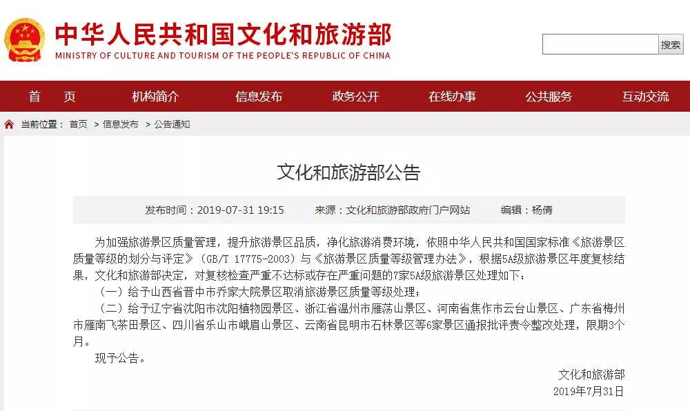 文化和旅游部关于处理7家5A级旅游景区的公告