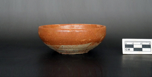 5件。大小、器形、纹饰基本相同。均为薄圆唇、直口微敛、浅斜腹内收,小平底微凹。内底有一圈弦纹,腹外部有清晰的釉线,釉线为不规则曲线,釉线下为裸胎。其中2件盏内、腹上部有保存完整的冰裂纹青釉(图七-图九),另外3件盏青釉,基本脱落(图一〇-图一二)。