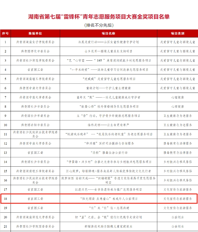近日,湖南省第七届“雷锋杯”青年志愿服务项目大赛获奖项目名单公示,湖南省少年儿童图书馆志愿服务支队“阳光阅读 点亮童心”未成年人公益项目获省级大赛金奖!
