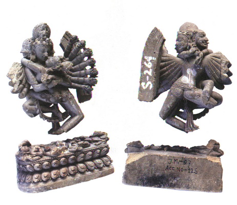 毗哇巴也是八十四大成就者之一,出自唯识派论师护法的后辈胜天门下,寂护是毗哇巴的亲教弟子。毗哇巴曾在苏摩普里寺研修佛理和密法,他融合《红阎摩德迦续》《胜乐根本续》,以《喜金刚续第二品》为基础,从因、道、果三方面进行修持,他直接领受了金刚持开示给无我母的密法,以喜金刚(Hevajra-Sakti)为本尊,创立了“道果”法。昆·贡却杰布通过卓弥译师获得毗哇巴的全部教授,于1073年在西藏仲曲河谷修建了萨迦寺。因此,持金刚、无我母、毗哇巴三尊一铺的形象,经常出现在萨迦派寺院的壁画中,标示着萨迦教法的心髓、开示和世间化现,而喜金刚正是萨迦“道果法”最主要的本尊。无独有偶,在苏摩普里寺遗址的发掘中,发现了一些残碎的石雕,在原始报告中公布了三件标本,一件是带帽冠的菩萨头部,一件是左手攥着钱袋的财神(Kubera),还有一件正是喜金刚(Hevajra)造像。这尊喜金刚造像6面,每个面上有3只眼睛,16臂,各执充填不明物的颅骨碗,中间一臂拥抱性力女神沙克蒂(shakti),后者代表性力、生命力,造像年代约在11世纪后期。这一发现从考古资料上证实了苏摩普里寺不仅经历了最初的大瑜伽阶段,还经历了无上瑜伽阶段。由于无上瑜伽是金刚乘的最后形态,在东印度存在的时间不长,因此,这类本尊造像极为稀少,因此也弥足珍贵。