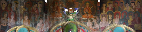 对于经堂四面墙体壁画的功能,我一直有纠结于心的困惑,壁画处在信众的朝拜道上,太嘈杂故,显然不是修行之地,如果说是给朝拜的信众作教化,题材中出现的无上瑜伽双身像,显然并不合适。在扎塘寺,我向一个修养深厚的喇嘛说出了我的困惑,他说,他无论是坐在垫子上,还是从墙边经过,只要看到这些壁画,“就象看到了熟人”,他将双手地放在心口,眼神中透出说到至亲时才会有的神情,我想起伟大的大圆满传承者无垢友,他也曾说过“好象在群众中认出老朋友一般”这样的话,这让我最终理解到,经堂壁画包含了大乘显教和密宗四续部生起、圆满次第的完整图像,每一尊神像的背后,都代表了一种相应的法类,以满足不同次第修行者的需要。对于未受密宗灌顶的僧人,经堂是学习大乘显教的地方,对于受过灌顶的僧人,经堂壁画则是在诵经的间隙,作为温习、坚固忆念的辅助,使修行者的正念得以相续,而沉浸在另一个世界(天慢)之中,任运而住而不出,以此对治“凡常境执”。宗喀巴《密宗道次第广论》卷19在论述僧人在修行间隙“中间之瑜伽”时也说:“如是前座已毕,后座未修,中间亦应作诸善事,此即清净受用瑜伽,谓自忆持主尊天慢,根缘境时,当观诸境体为诸天,由彼供养。……若能一切时中依止正念,即是速能圆满二种资粮方便。”密宗修行不光在密室之内,僧人在行住坐卧之间,皆在定中。这样一来,长久以来的困惑也就涣然冰释。