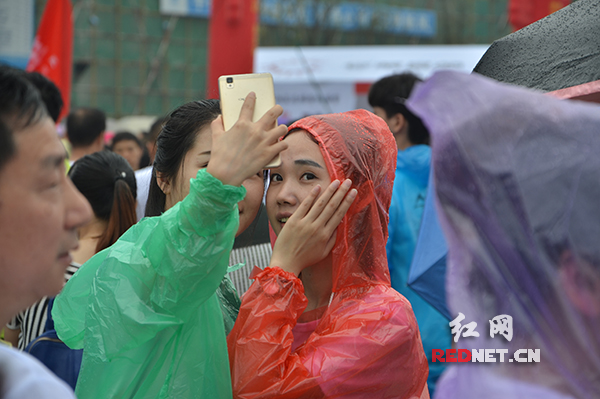 开幕式上,冒雨自拍的参赛者。