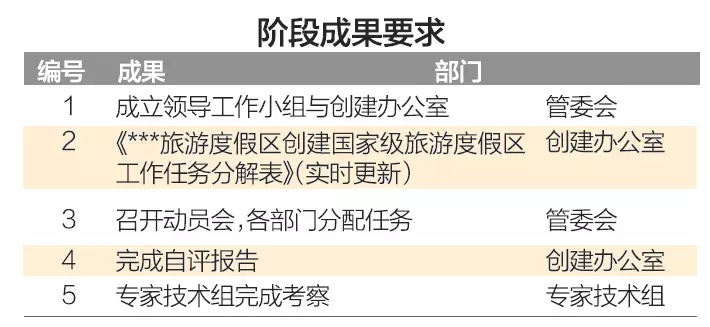 度假区、景区、有创建任务的乡镇、相关职能部门领导成立创建国家级旅游度假区领导小组,依据《创建国家级旅游度假区工作任务分解表》逐项制定创建子方案,落实责任领导,落实责任机构,落实责任人,并上报创建办公室;管委会负责召开创建工作动员会,部署创建具体工作和任务。