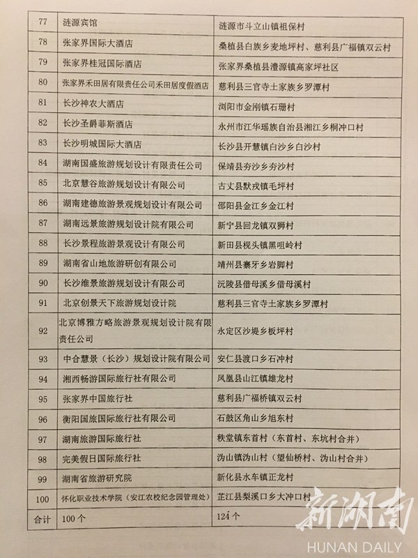 全省旅游扶贫推进大会今天在长沙召开。会上推出我省第一批旅游企业“百企联百村”对口帮扶名单,发动100家企业对口帮扶7个市州的124个贫困村。