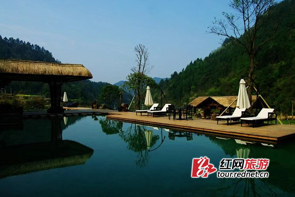 “五号山谷”建筑风格继承当地人和自然相处的理念,每一处都是顺应自然而设计的,有中式禅意或异域风情的果园树屋,有土家族传统的泥巴抢瓦小屋,中心区域设有露天游泳池和月神酒吧。