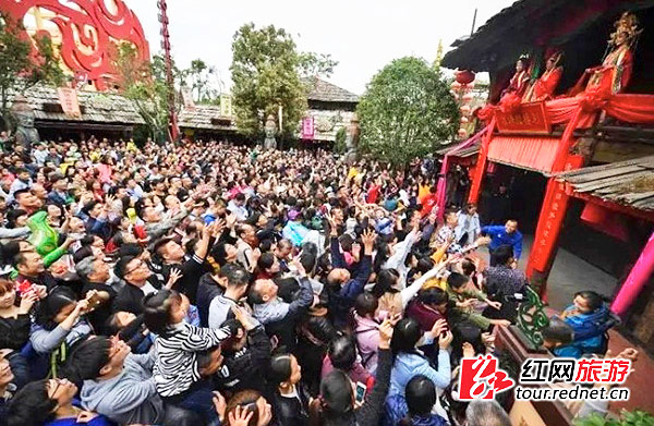 2017年国庆中秋黄金周,刚开放3个月的宁乡炭河古城表现亮眼,《炭河千古情》一天曾连续演出7场,炭河古城景区一天接待5.6万人次,创下新纪录。图为游客们在彩楼前“抢绣球”。景区供图