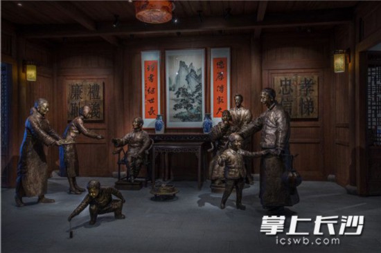 展示馆围绕“家”的主题,秉持“一个人,一个家,一座城,非遗即生活”的策展理念,将主展区分为家堂、家艺、家音、家味、家节、家人六大部分。其中,家堂展现的是一组雕像,表现了民国时期长沙一户人家四世同堂过年的热闹场景;家艺展现的是菊花石雕、浏阳花炮等多姿多彩、工艺精湛的传统技艺遗产;家音展现的是长沙花鼓戏、长沙弹词等极具艺术魅力、深受群众喜爱的音律表现形式;家味展现的是玉楼东六大传统湘菜、火宫殿八大传统小吃等非遗美食的制作技艺;家节展示的是祭孔、庙会等一系列形式多样、内涵丰富的长沙节庆文化;家人展示的是一批批德艺双馨的长沙非遗传承人风采。
