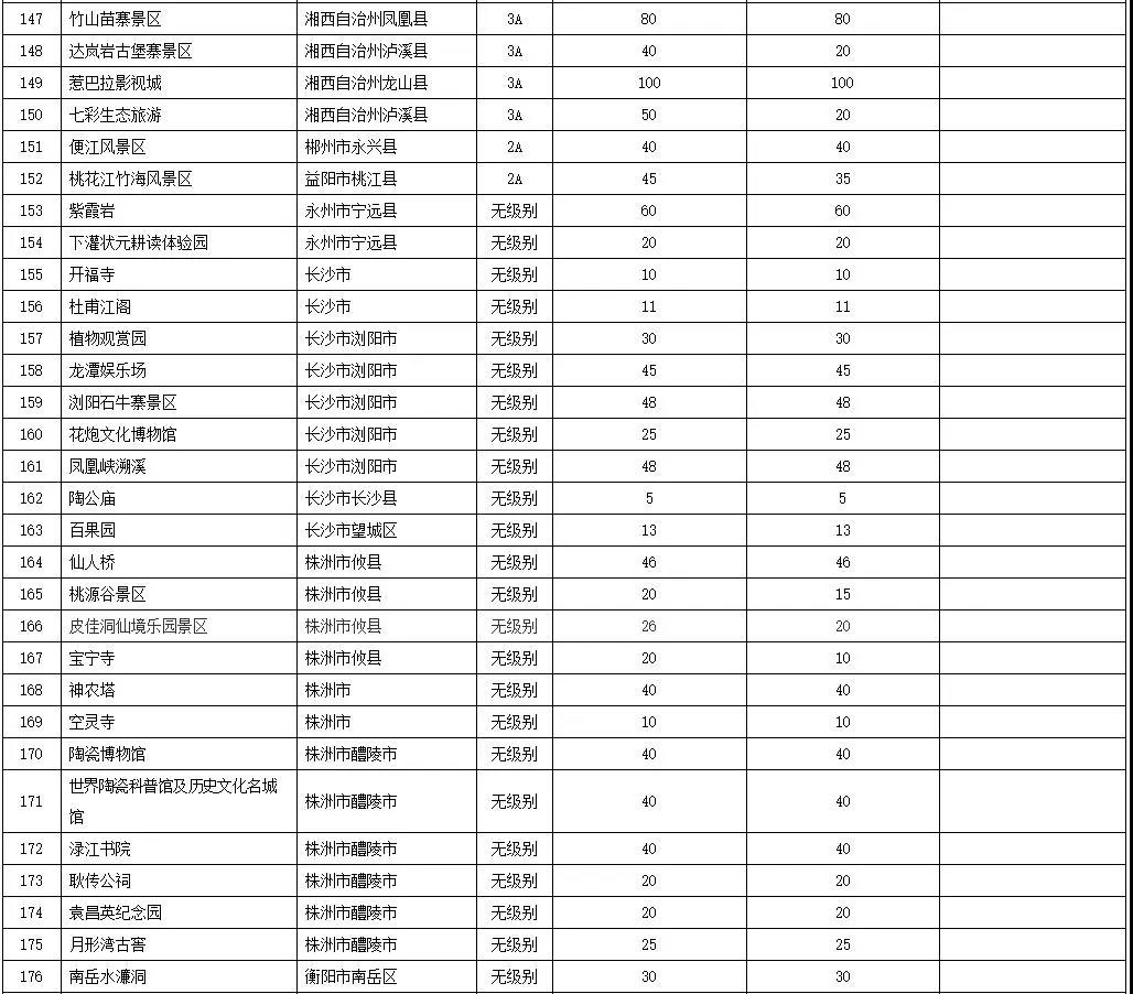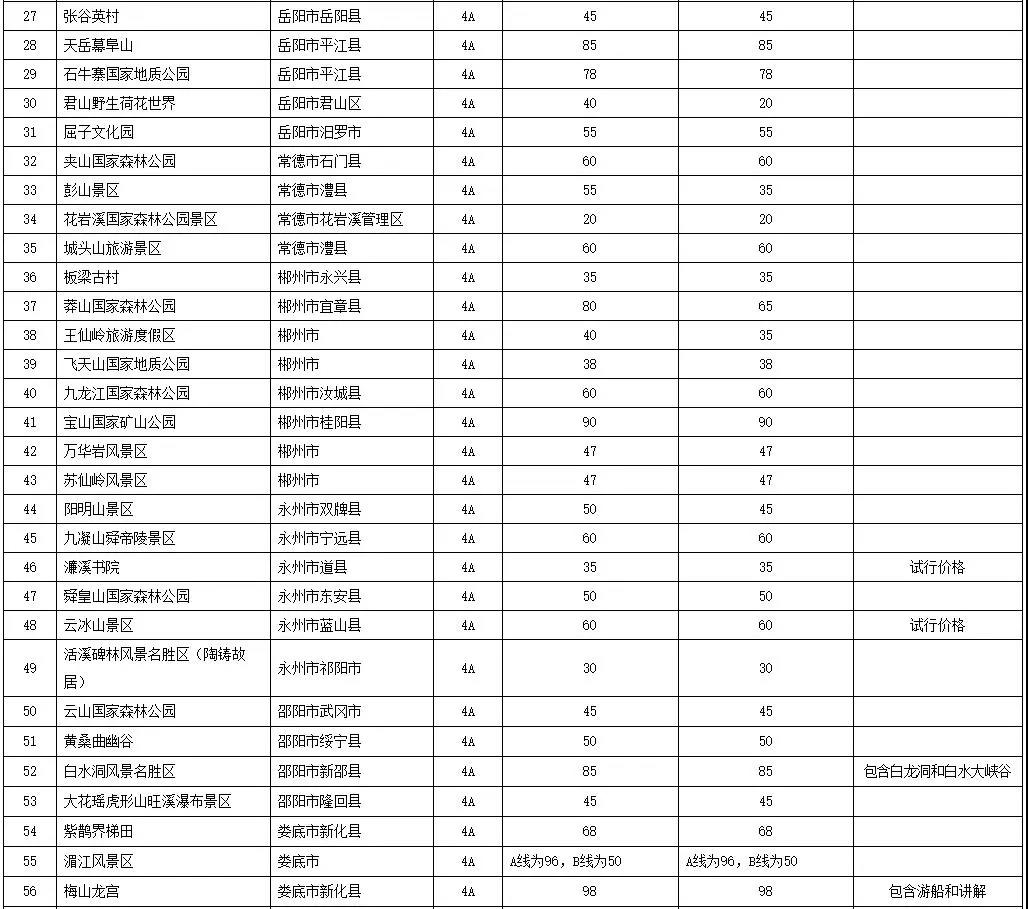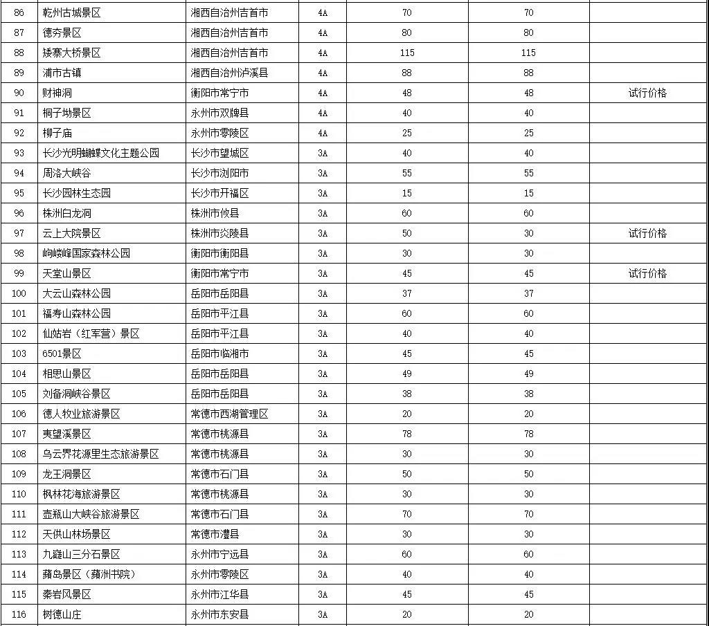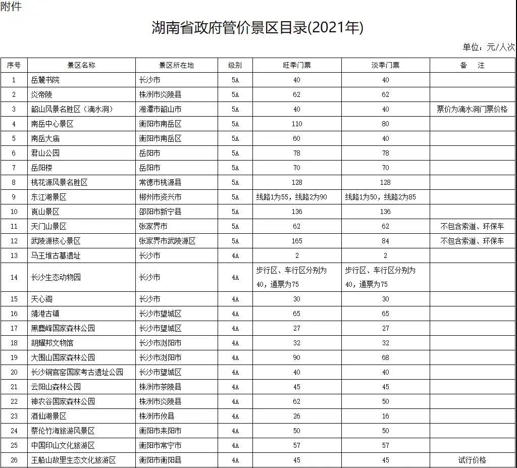 值得注意的是,按照《目录》,岳麓书院门票为40元,炎帝陵62元,韶山风景名胜区(滴水洞)门票价格为40元,南岳中心景区旺季门票110元,淡季80元,君山公园票价为78元,天门山景区旺季、淡季门票价格均为62元,桃花源风景名胜区票价为128元,崀山景区票价为136元,武陵源核心景区旺季票价为165元,淡季票价为84元,长沙生态动物园票价步行区、车行区分别为40元,通票为75元。