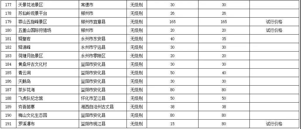 此外,按照《湖南省景区门票及相关服务价格管理办法》规定,应纳入政府管价但目前尚未纳入《目录》的新建景区,各地可制定试行门票价格,试行期最多不超过2年。