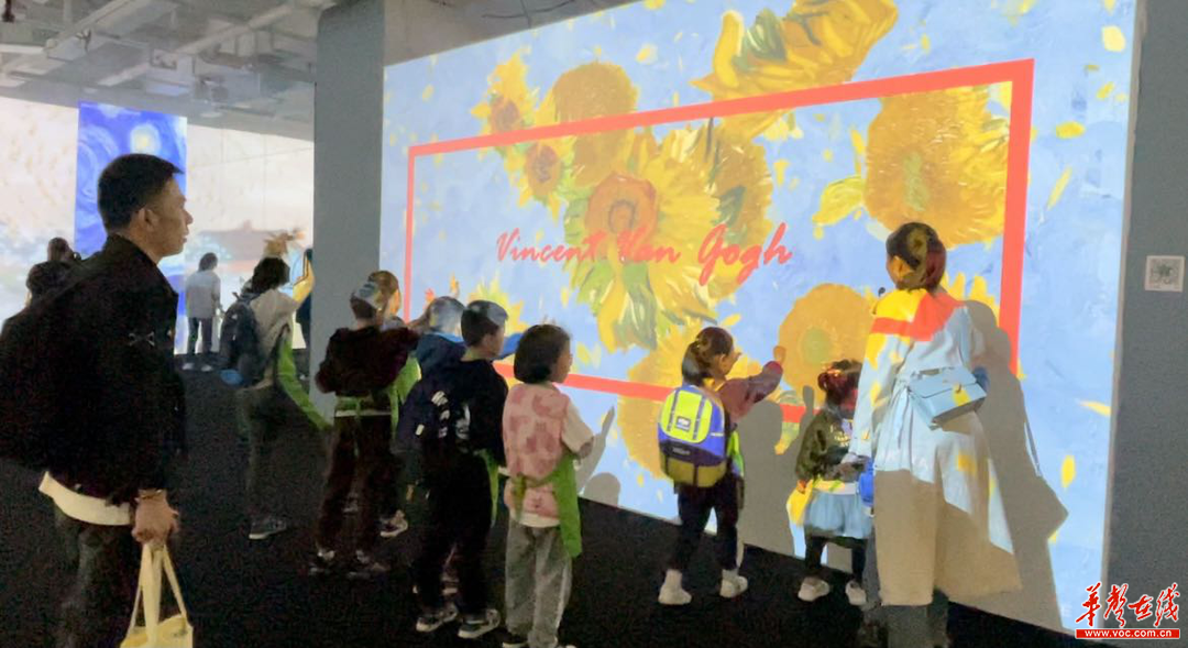 5月24日,展厅中,一群6、7岁的孩子们正用指尖追逐着幻化的光迹,忍不住发出惊叹。一旁,8岁的刘轩祺拿出画笔,边画边说:“我感觉要被‘星空’吸进去了!”带队老师、长沙奈加美术教育的杨老师告诉记者,这种交互艺术能让梵高的画作显得生动有趣,更容易被孩子们接受,也更容易培养美的感受。“孩子们的艺术感受力很强,他们往往会给你想不到的惊喜,所以我们让孩子们带上了画材包,希望在现场激发他们的想象力和创造力,进行再创造。”