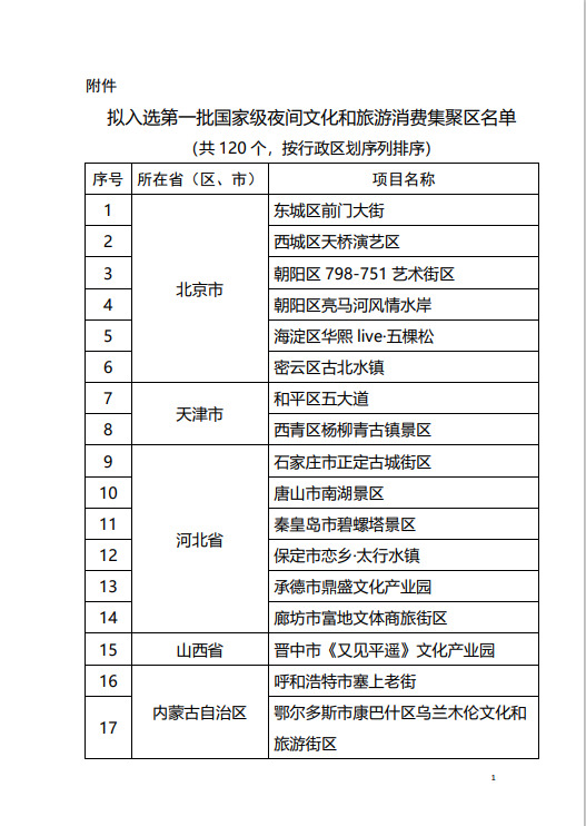 据文化和旅游部网站消息 文化和旅游部10月19日发布《关于第一批国家级夜间文化和旅游消费集聚区名单的公示》: