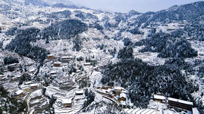 冬日的紫鹊界梯田即将褪去斑斓色彩,披上素净白雪。大雪之后,两千年历史的梯田如白色浮雕般层层展开,天然水利系统在冰雪下暗涌生姿。