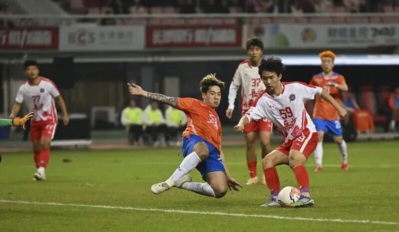 2025“湘超联赛”第10轮长沙队与益阳队的比赛,高中生球员马子宜(右)破门得分。