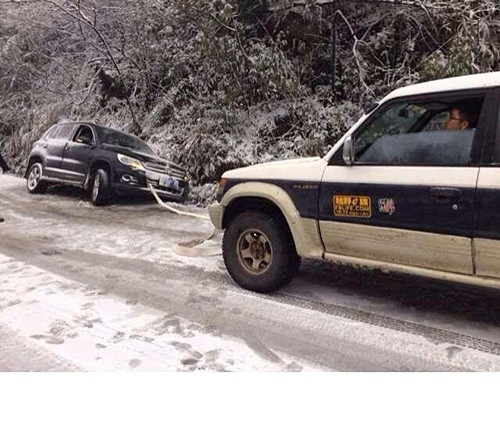 小分队成员放弃春节与家人团聚,积极运用自己配备U型勾、拖车绳、无线对讲机等专业救援工具,在严寒中义务为事故车辆提供救援帮助。如此举动深深感动着在场的每一位游客,这样的正能量值得赞扬。