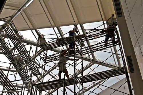 作为崀山创建国家5A级旅游景区必备的硬件设施之一,2013年5月,新宁县投资2500万元,动工修建了包括售票中心、购物中心、公厕、旅游公交车站等在内的大型游客集散中心,其中游客中心建筑面积达1405㎡,为便于采光,安装了近300㎡的透明玻璃顶棚。游客中心建成后,为游客的旅游、购物、查询、休息等带来了很大的方便,但由于玻璃顶棚没有安装遮阳帘,刺眼的阳光往往给大厅的游客带来不适。