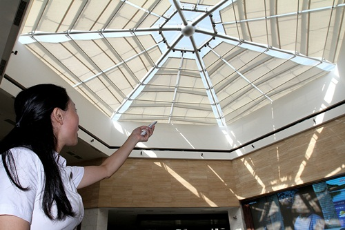 8月24日上午,随着太阳的逐步升高,强烈的阳光透过崀山游客中心的透明玻璃顶棚,把游客休息大厅照得明晃晃的。只见前台值班的小许手拿遥控器对着屋顶一摁,六面十二块白色帆布遮阳帘应声徐徐上升,很快把透明玻璃顶棚遮挡得严严实实,阴凉而舒爽的感觉立刻充溢了整个大厅。这是崀山游客中心自从玻璃顶棚有了遮阳帘以来发生的最明显的变化。