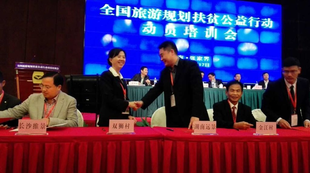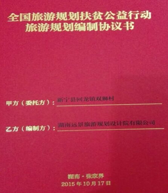 10月17日,新宁县回龙寺镇双狮村受邀参加国家旅游局在张家界举行的“全国旅游规划扶贫公益行动”动员培训会。该村被纳入国家旅游局帮扶范围,成为了全国289个、湖南省14个、邵阳市2个中的幸运儿,并于当天与帮扶单位湖南远景旅游规划设计院有限公司签订了全国旅游规划扶贫公益行动旅游规划编制协议书,帮扶单位将在未来3年对其进行规划编制、业务培训、招商引资等系统扶助, 致力把双狮村打造成高起点、高标准、高品质的乡村旅游点。