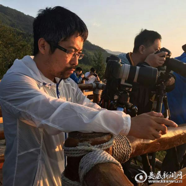 (北美摄影协会名誉会长刘宇等摄影爱好者清早就拿起相机抓拍紫鹊界的日出  王旭哉/摄)