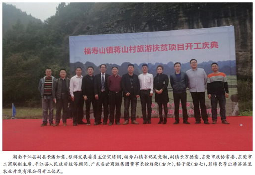2016年11月21日,岳阳市平江县福寿山镇蒋山村溪溪里农业开发有限公司开工仪式隆重举行。平江县副县长潘如意,旅游发展委员主任宋炼钢,福寿山寿镇书记吴竞湘,副镇长万德意,东莞市政协常委、东莞市工商联副主席、平江县人民政府经济顾问、广东盛世商潮集团董事长徐辉荣,杨子荣,彭绵长等出席溪溪里农业开发有限公司开工仪式。