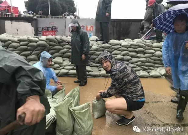 7111时,湖南海外旅游有限公司接到街道通知,告知防汛形式严峻,急需人手支援,公司组织值班人员陈曦、姜钟立即前往接待防汛点报到,总经理黄彬紧急从家中赶来,投入抢险工作。在街道人员的指挥、协调下,在大家同心协力下,装沙填沙,紧急建立起了子堤,堵住了江水的缺口。同时,湖南海外旅游向有关部门捐款一万元。