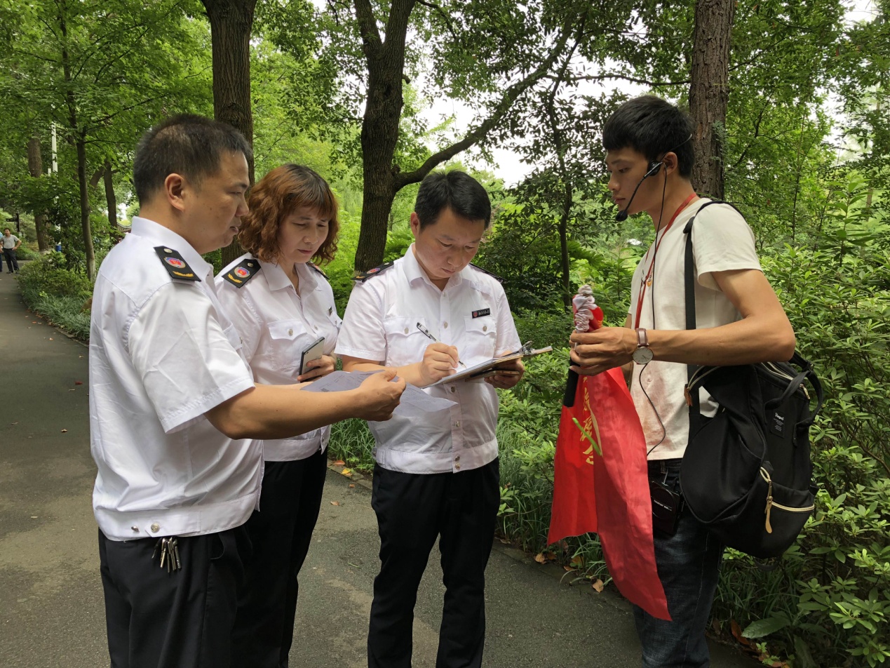 旅游质监所执法人员在宁乡花明楼景区检查导游执业情况。