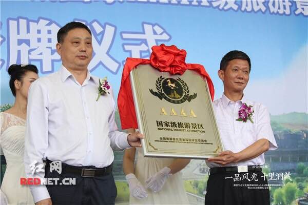 湖南省旅游发展委员会调研员夏阳春(左)给湘窖生态文化酿酒城授牌。