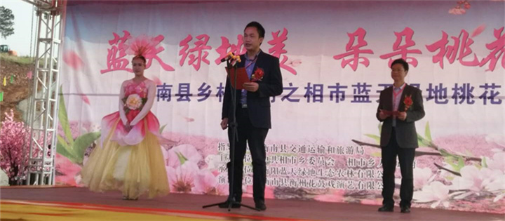 3月22日上午10点18分,衡南乡村生态旅游春季赏花节之相市蓝天绿地桃花节活动在衡阳蓝天绿地生态农林基地正式启动。衡南县交通运输和旅游局长刘振国致词,县政府办副主任谷福容宣布活动启动,相市乡党委书记肖恒会致欢迎词,相市乡党委副书记、乡长肖明剑主持仪式。