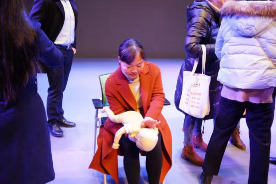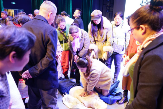 李文峰老师先给我们做了救护新概念、救护安全原则、白金十分钟理论知识的讲解,并以简单易懂的语言向我们详细讲解了心肺复苏术、气管异物急救海姆立克手法、自动除颤仪(AED)的使用等救护原理及技术手段,同时介绍了急救的原则、目的、程序、自我保护等诸多方面的理论知识。团队里的老师们还进行了模拟示范,并现场指导观众实际操作心肺复苏术和海姆立克手法。
