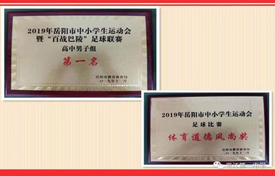 2019年11月24日,岳阳市“体彩杯”中小学运动会暨“百战巴陵”足球联赛平江县第一中学足球队以全胜战绩勇夺联赛高中组冠军!
