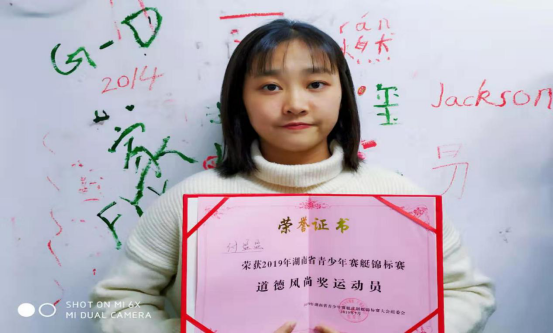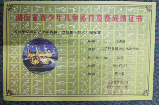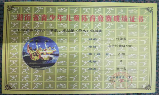 湖南省青少年赛艇、皮划艇(静水)锦标赛女子轻量级全能第一名。
