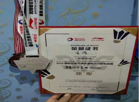 获得2019年度道达尔李宁李永波杯3V3羽毛球赛男单(30-39)岁组亚军