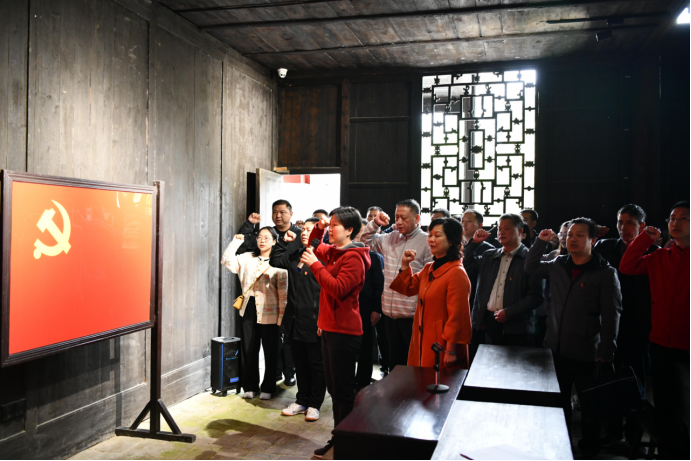 在塘田战时讲学院旧址,一幅幅鲜活的照片,一件件珍贵的遗物,一份份泛黄的史料,再现了抗战先辈们艰苦卓绝的革命历程和热血澎湃的家国情怀……跟随着讲解员的引导与讲解,全体党员干部认真参观了讲学院旧址,驻足阅览书籍、照片等珍贵史料,一边参观一边交流,追溯革命先辈负重前行的足迹,感受血与火的峥嵘岁月。在鲜红的党旗前,全体成员举起右手,重温入党誓词。