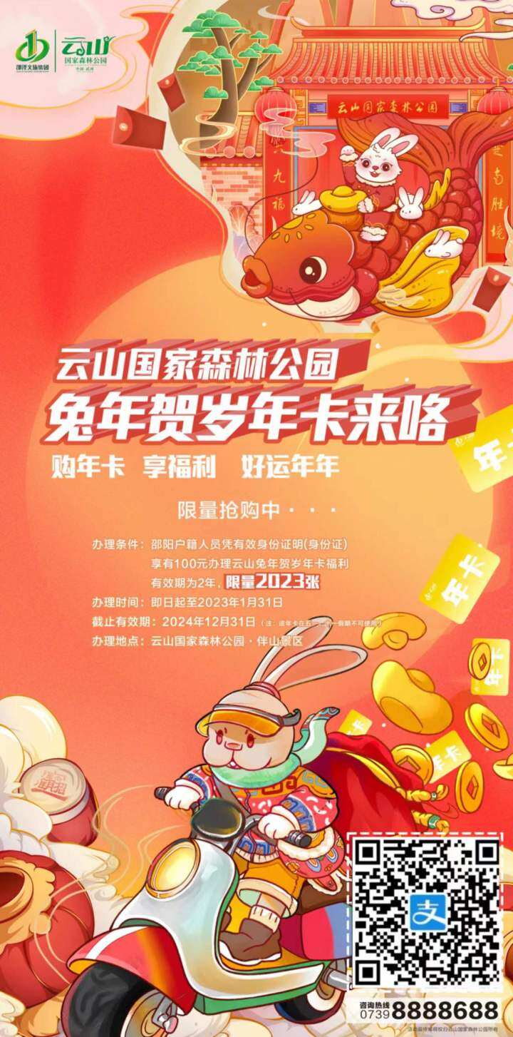 武冈云山景区从即日起至1月31日,推出限量版云山兔年贺岁年卡(限2023张),邵阳户籍人员凭身份证可在线上支付宝或到武冈云山半山景区入口办理该卡,仅需100元,即可两年内可以无限次畅游云山景区。