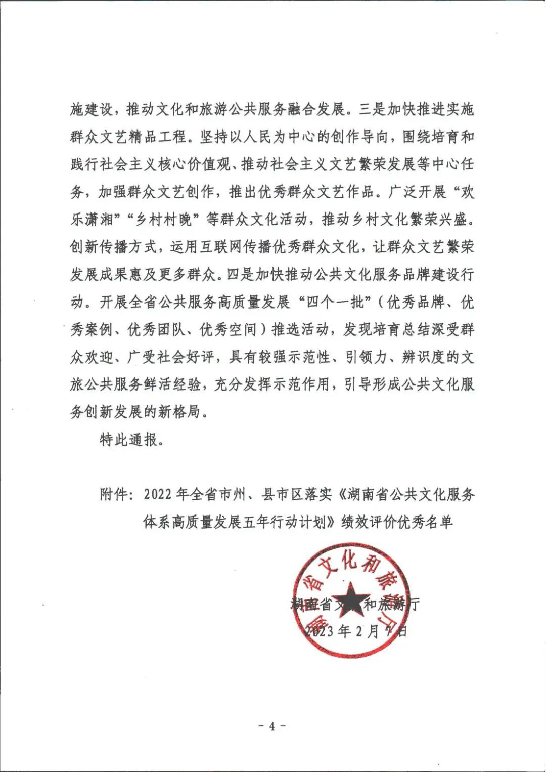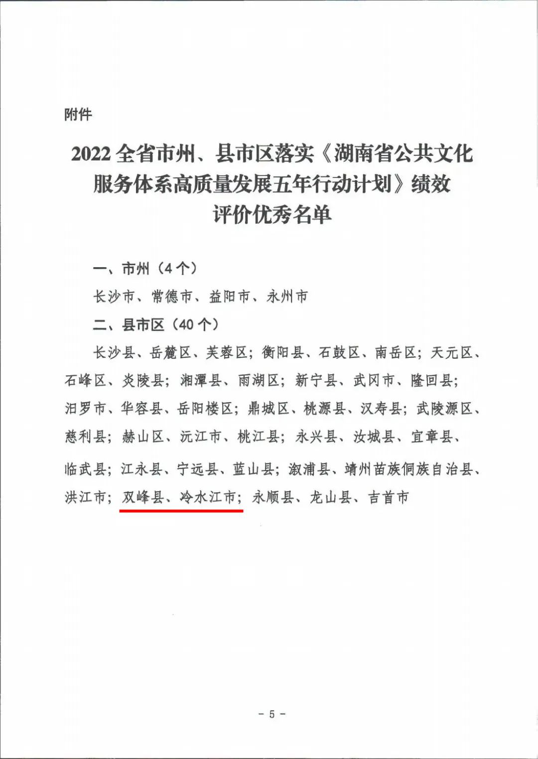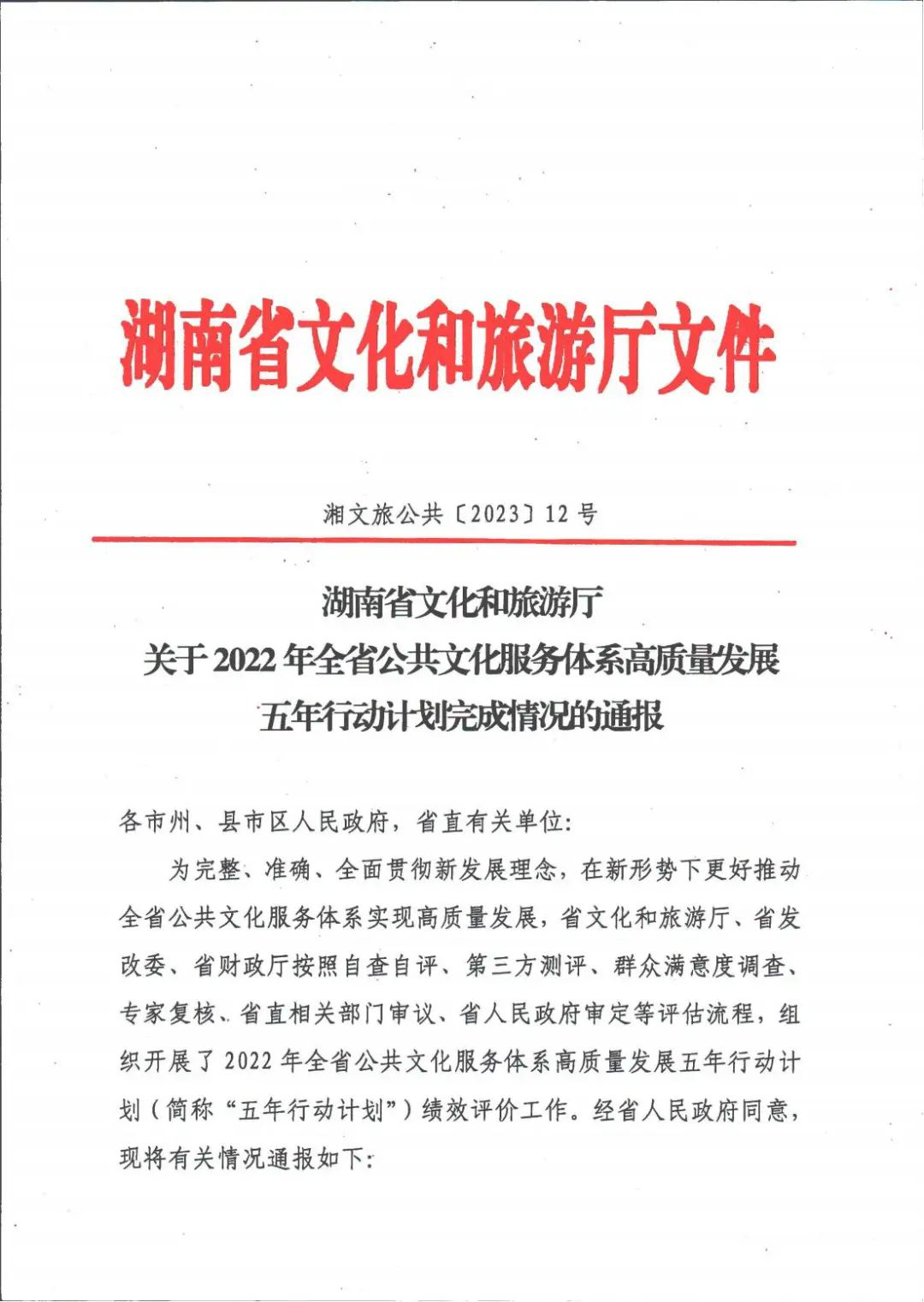 近日,湖南省文化和旅游厅印发《关于2022年全省公共文化服务体系高质量发展五年行动计划完成情况的通报》,双峰县、冷水江市荣获2022年全省公共文化服务体系高质量发展五年行动计划绩效评价“优秀”县。