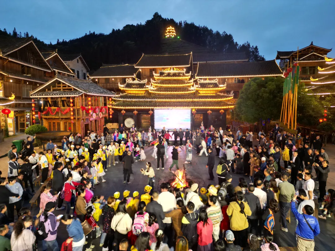 五一假期,游客在皇都侗文化村体验篝火晚会