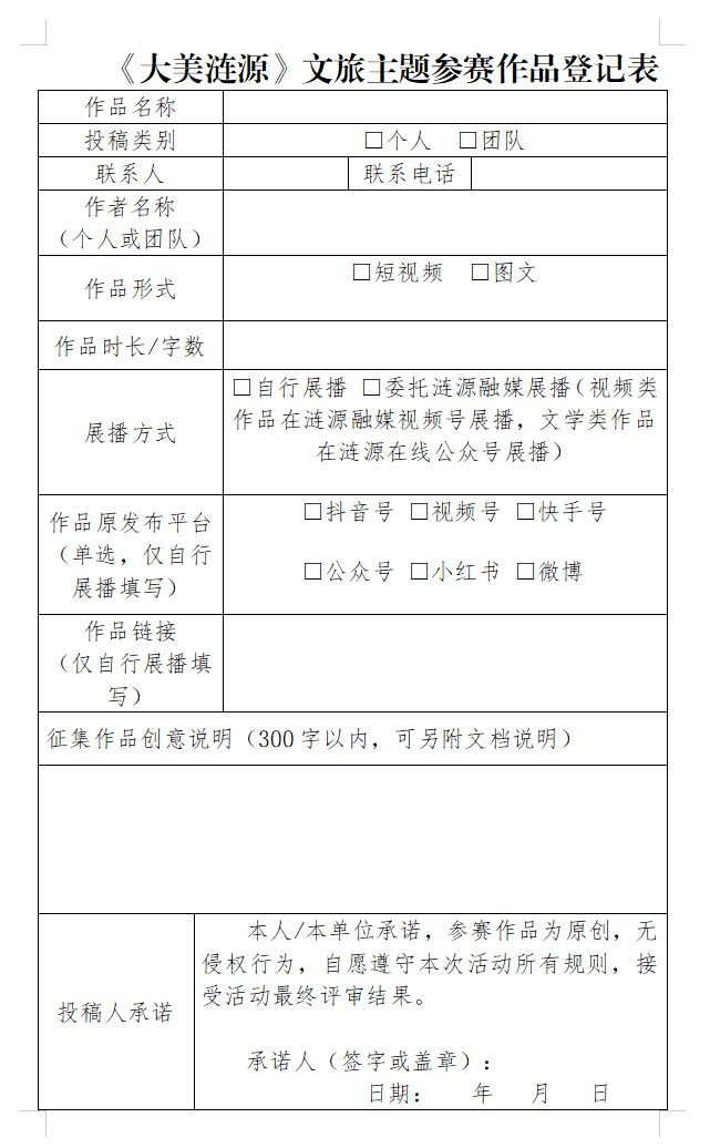 (二)邮件要求:邮件标题统一命名为“《大美涟源》+作品名称+姓名/单位+联系方式”,邮件内附作品文件、及征稿登记表(见附件);