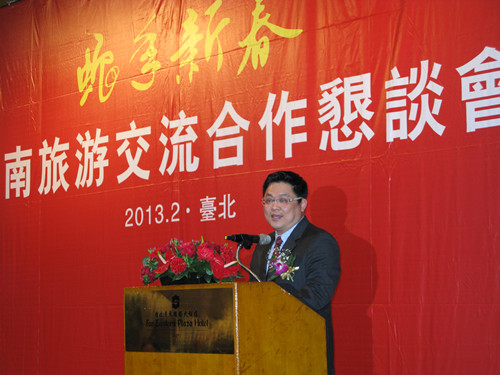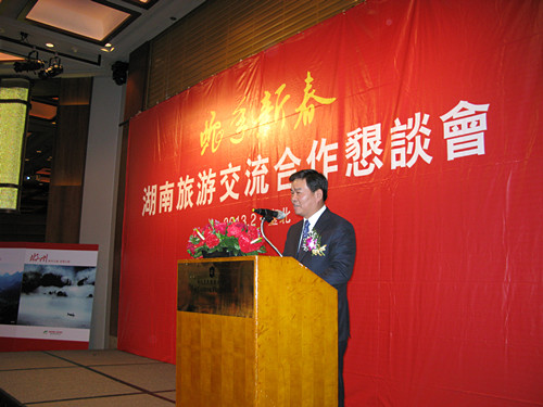 蛇年春早,为进一步加强湖南与台湾的旅游交流与合作,2013年2月20日下午,省政府在台北远东香格里拉国际大饭店举办了“蛇年新春 湖南旅游交流合作恳谈会”。省政府副省长何报翔出席会议并致辞。台湾海峡两岸观光旅游协会副会长刘喜临、海峡两岸旅游交流协会台北办事处主任满宏卫出席会议并分别致辞。会议由省人民政府副秘书长王光明主持。省旅游局局长、湖南省旅游协会会长杨光荣出席会议并介绍湖南旅游情况。省旅游局副巡视员卜越辉出席会议。