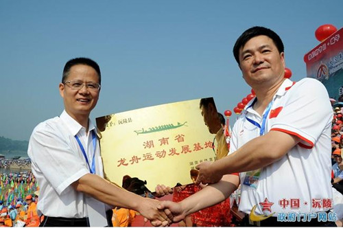湖南体育职业学院副院长、湖南省龙舟协会副主席李星白授予沅陵县“湖南省龙舟运动发展基地”牌匾