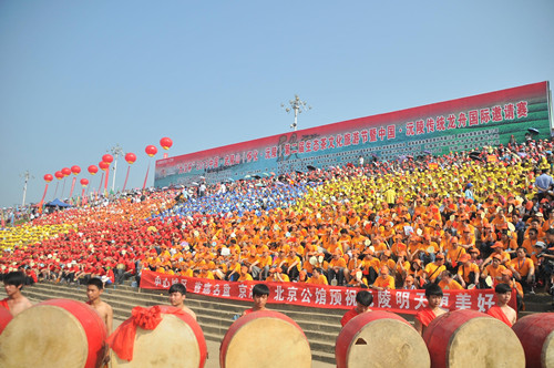 “拜天,风调雨顺;拜地,五谷丰登;拜神,国泰民安”随着祭坛上的大鼓响起,众汉子托酒跪拜齐声呐喊,开启了龙舟赛的祭祀仪式。随后,湖南省龙舟协会副主席吴秋里登上祭坛为神龙点睛,湖南省社会体育指导中心主任、湖南省龙舟协会副主席周光正为龙舟出江鸣锣。身着红色傩袍的祭师和手拿火把的龙舟传承人,率众汉绕祭坛一周,祭师提利斧雄鸡,口念法语,斩断鸡头,这便是“跑火关头”。参加游江的龙舟依次出江、慢划,举行游江仪式,4只龙舟进行抢红表演。神秘而隆重的龙舟祭祀、游江仪式后,来自德国、英国、马来西亚、葡萄牙、澳门、香港的8支国外和港澳地区龙舟队在沅江中擂鼓竞渡,进行此次国际标准龙舟赛的比赛。在随后的两天赛事中,来自武陵山片区的20只龙舟、1000余名龙舟健儿还将进行中国传统龙舟赛的角逐。